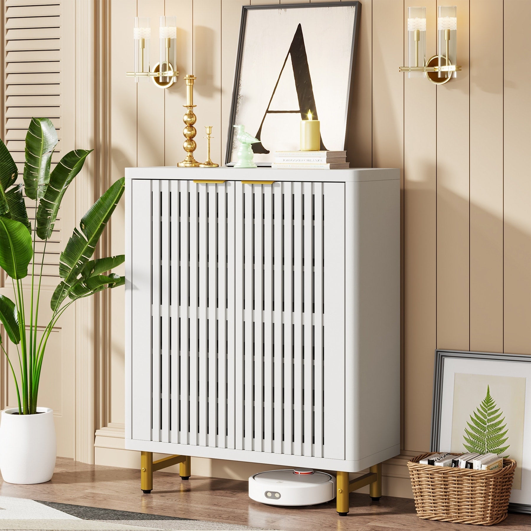 Capture the essence of modern design and convenience with our 2-door shoe cabinet. Its doors are artistically crafted with a striped hollow design that adds to the overall elegance of the cabinet. Hidden behind the doors are five adjustable spacious shelves, making it the perfect storage solution for your footwear collection. Constructed from durable engineered wood and supported by heavy-duty metal legs, this shoe storage cabinet is built to last. The overall dimensions of this cabinet are 13.78'D x 33.46'W x 43.31'H, making it an ideal fit for any space. The package includes foot pads and easy-to-understand assembly instructions for your convenience.