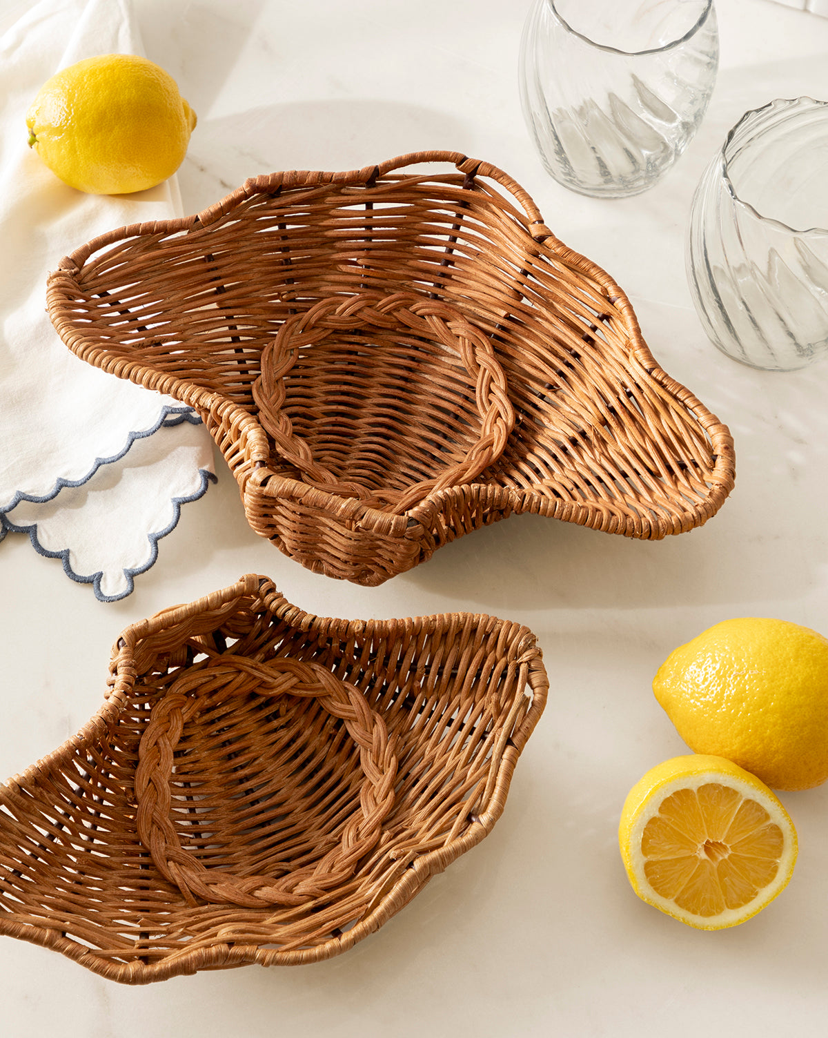 Tissé à la main en rotin couleur caramel, le plat Concha de Sharland England apporte texture et chaleur à tout espace. Sa forme organique le rend parfait sur une table basse, une console ou un comptoir de cuisine.