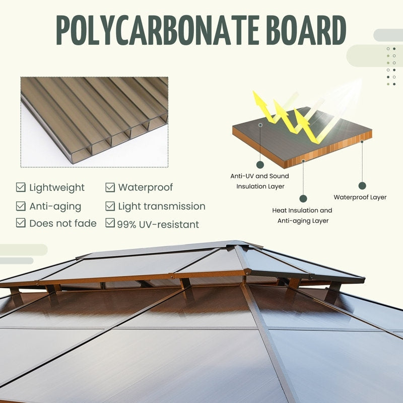 Crafted with premium-grade aluminum alloy as the primary frame material, this gazebo achieves an optimal balance between weight and load-bearing capacity. Its meticulously engineered frame structure ensures overall stability while significantly simplifying the assembly process. The aluminum material boasts exceptional corrosion resistance, maintaining its pristine appearance even with prolonged exposure to humid environments. Manufactured using fully recyclable eco-friendly materials with substantially reduced energy consumption during production, it allows your outdoor leisure activities to align with sustainable environmental principles.