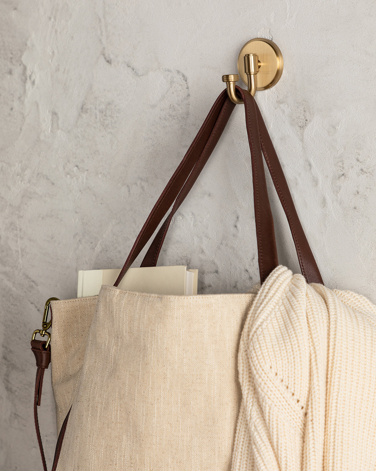 Le crochet en laiton Kent est à la fois un détail métallique sophistiqué et un atout fonctionnel. Son extrémité arrondie est raffinée et accueillante, tandis que sa forme élégante en laiton rehausse un couloir ou un vestiaire.