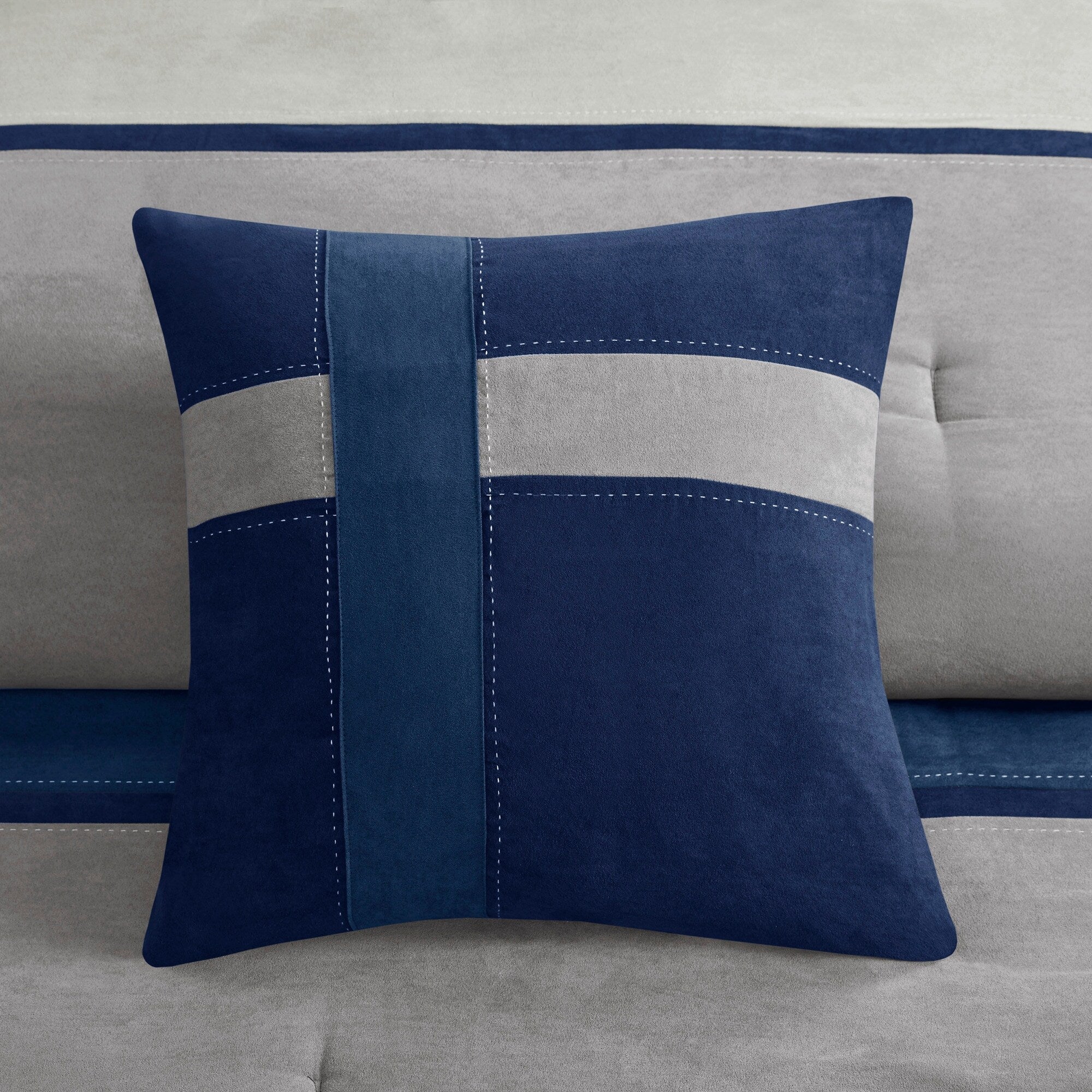 The Madison Park 7 Piece Hanover Comforter Set offers you a casual alternative in fashion bedding. The reverse of the comforter is solid Blue. The soft microsuede in heather grey, Blue and charcoal grey is pieced together to create this beautiful bed. The decorative pillows are embroidered and pieced to add a decorative element to this simple, yet beautiful bedding collection. With hypoallergenic filling in the comforter and pillows, this stylish comforter set easily refreshes your bedroom decor and is machine washable for easy care.
