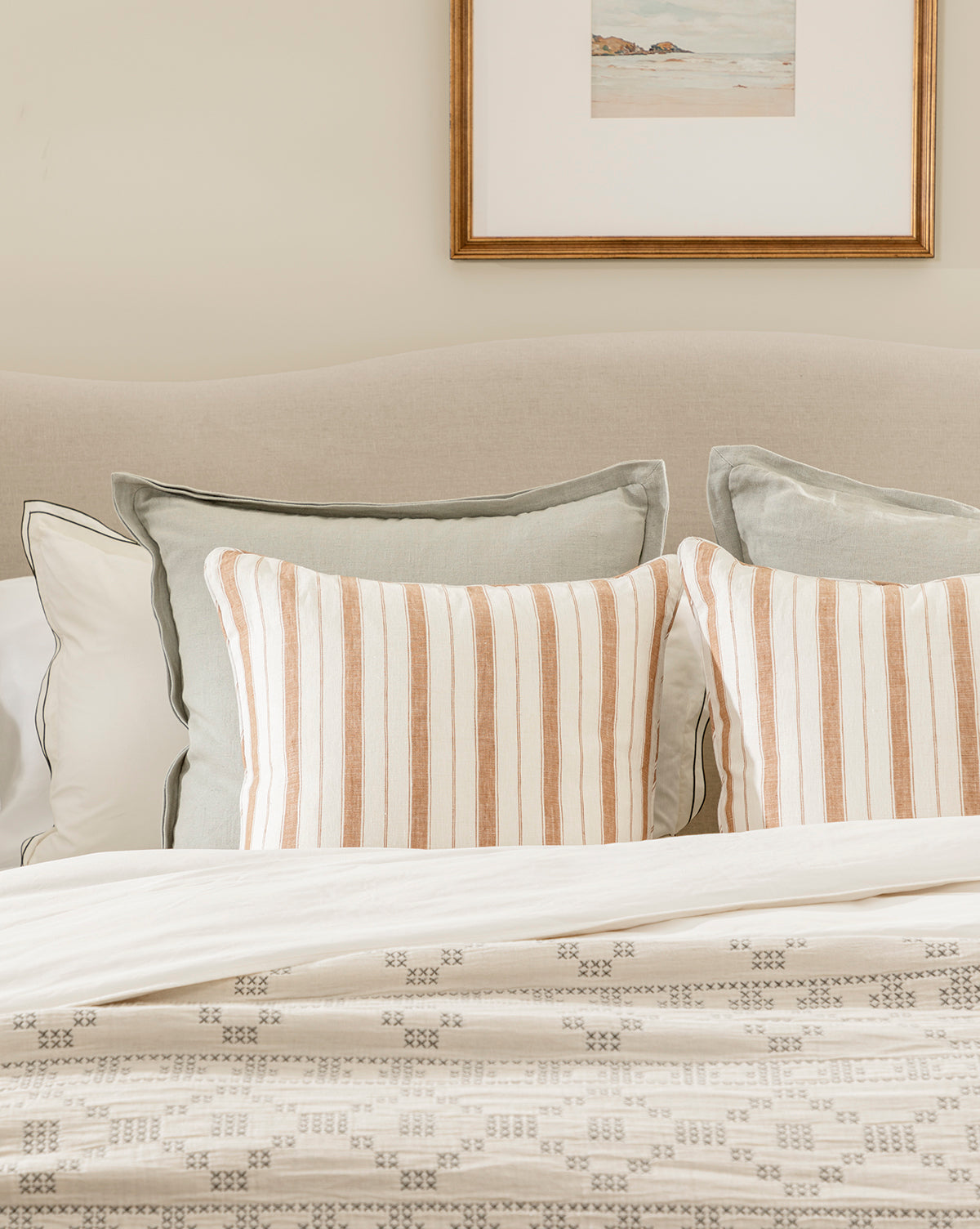 Avec ses rayures 100 % lin teint en fil et sa bordure passepoilée, notre housse de coussin Rory apporte profondeur, caractère et sophistication à vos superpositions textiles. Ornée d'un motif rayé aux couleurs Pantone tofu et lion, elle dégage un charme classique et apporte une touche chaleureuse à votre chambre ou votre salon.